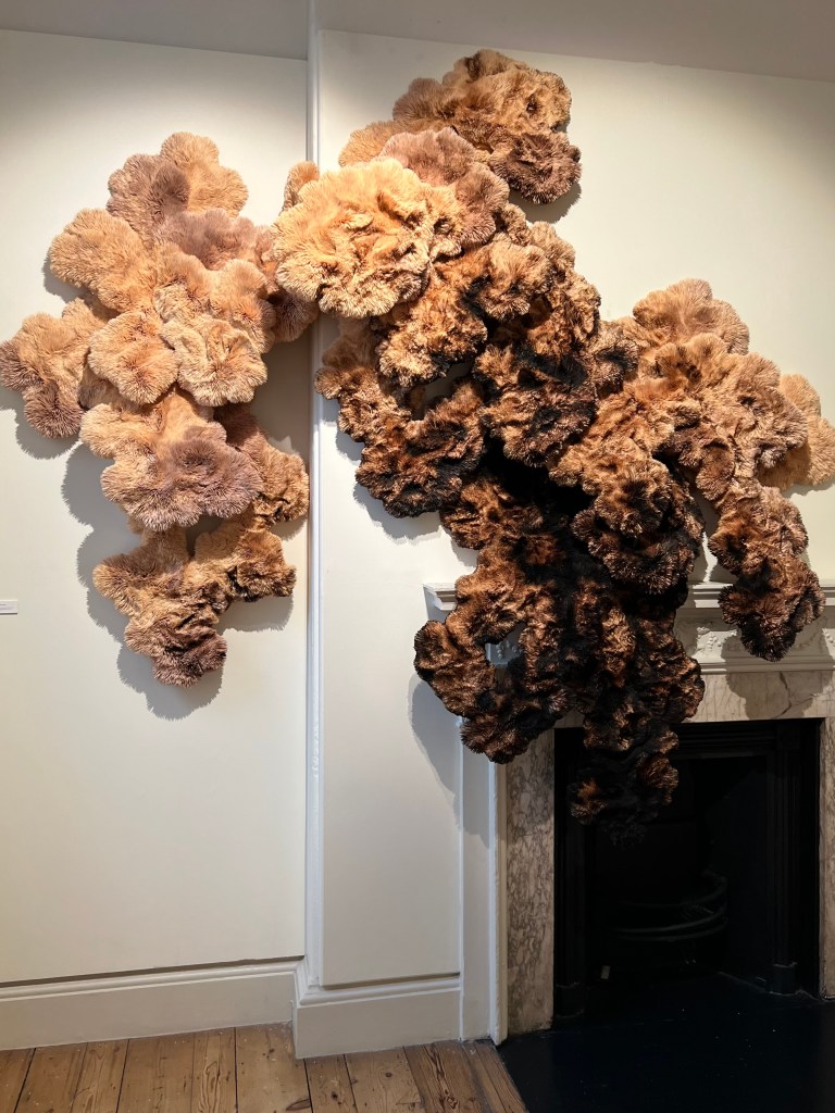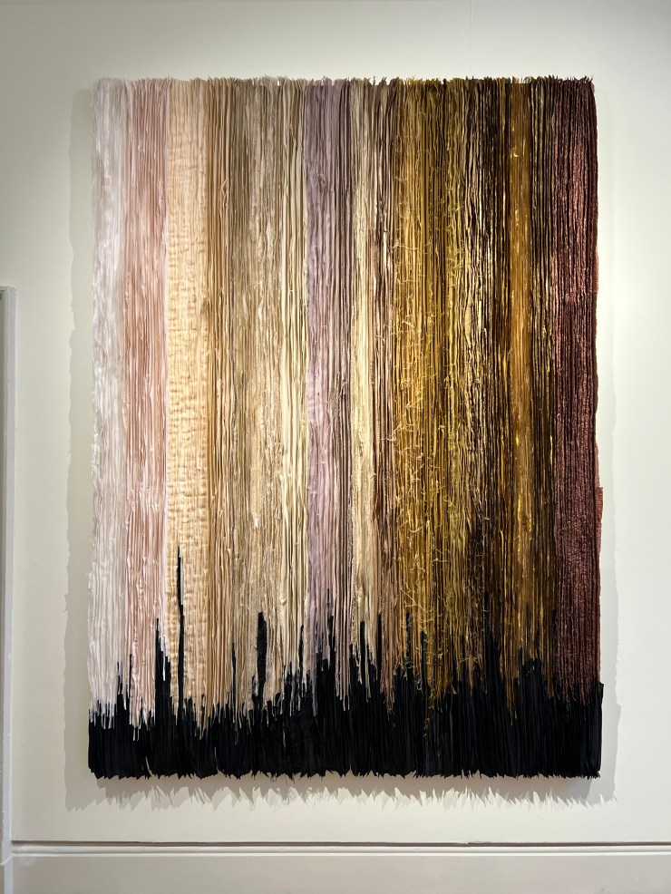 Primo Marella Gallery had works by Abdoulaye Konaté and Joël Andrianomearisoa. Both artists infuse their heritage into their work, Abdoulaye Konaté is a Malian artist, and his works are made from coloured cotton strips. Traditionally trained as an architect, Joël Andrianomearisoa uses a range of materials from fibres, silks and species of rare plants. His work explores life, and the range of emotions that come from being alive. Visually it was a good juxtaposition between the two artists, Konaté’s colours are more vivid, and his strips are wide, while Andrianomearisoa’s colours are muted, and his strips are thin.