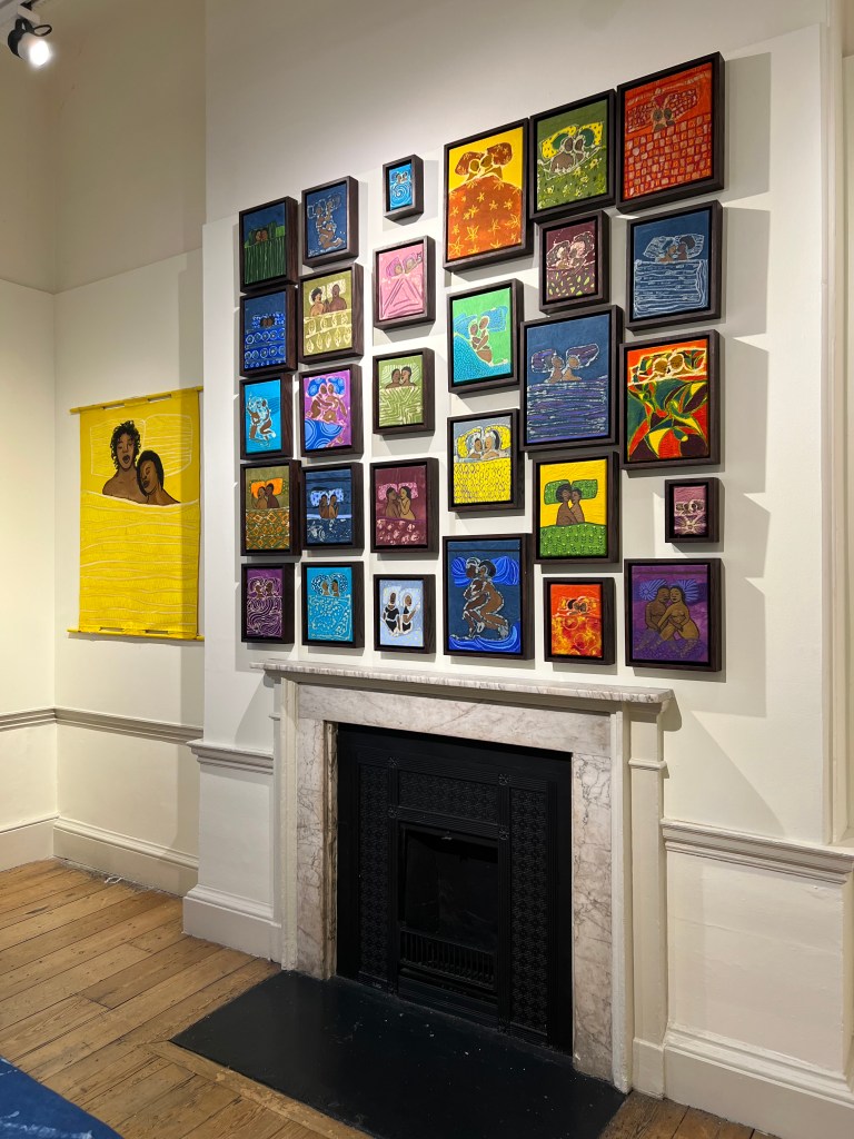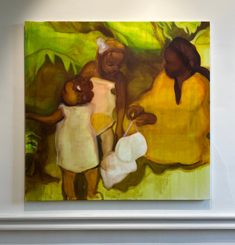 DADA Gallery did a solo presentation with Bunmi Augusto. Bunmi Augusto is someone I’ve been following for a very long time. Surrealism meets Yoruba culture; the artist creates these dream-like scenes that are imbued with her Yoruba heritage, and we see this from the clothes to the face markings.