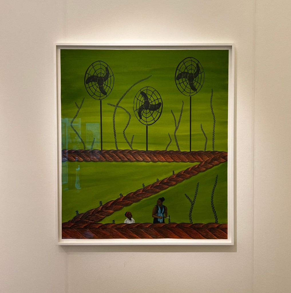Last in this selection is my number one booth, Berntson Bhattacharjee Gallery, and they did a solo presentation with Sola Olulode. My love for the booth comes from what Sola Olulode did, she completely took control of this space, from the pieces that were shown to the bed installation. I remember interviewing the artist, and we discussed the concept of the bed, and how it makes us feel safe. This very notion is reflected in the works, her figures are at peace, and they feel comfortable. It is universally considered that the bed is a place where we can feel vulnerable, especially in the presence of someone we care about and love, and this is truly evident in the body language of Olulode’s figures.