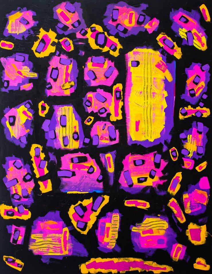 With regards to the colours used, they are black, yellow, pink, and purple. When it comes to the colour yellow, Rebecca stated its inclusion in the piece was deliberate, and we can partially deduce this because the colour stands out in the painting. “I included the yellow because it gave the painting a garish and punky ethos”.