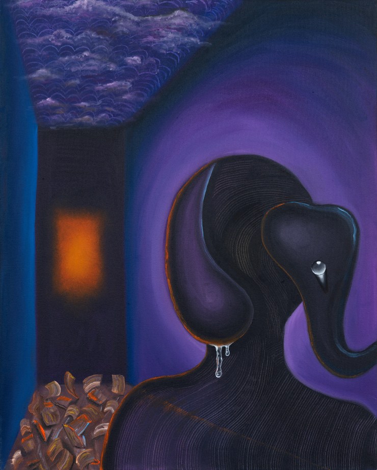 Waiting for a rude awakening was a piece that really spoke to me, and it was its dark colour palette that initially captured my attention. If we look at this piece, we can see a female figure peering into this orange light, above them is water and below are blocks of wood. If we further analyse the interior of this piece, we can see that the figure is in a narrow space. With such a claustrophobic environment, I was intrigued, and because this was done in 2020 – the year of the pandemic, I asked Larissa if this piece was indicative of her emotions during that period – this feeling of being trapped in a never-ending situation. Larissa’s answer was the following: “That idea of this piece representing claustrophobia is something I hadn’t even thought about. But definitely! Around that time, I mentally felt claustrophobic. 2020 was the year of the pandemic, and I really felt like I had to get out. I was trapped in here… In my apartment. I had nowhere else to go, and I just had to look within. So every time I would paint, it felt like I was standing in front of a mirror and saying to myself, ‘What am I trying to say? What am I trying to discover about myself?’”.