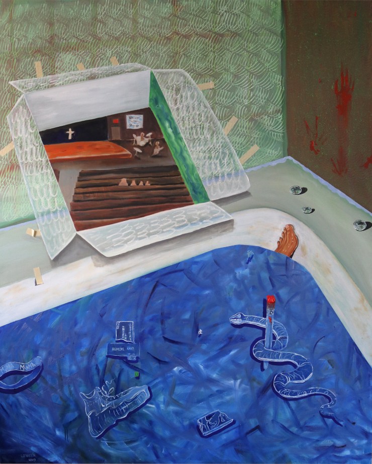 As a child, the artist grew up in the church. Her mother was a singer at the church, and her father was a pastor for a period. To add to that, her grandparents had a church, and they were pastors too. So when the conversation steered towards religion, in the words of the artist, ‘it was like opening Pandora’s box’. “The conversation with my mother didn’t really go anywhere. I didn’t feel listened to, and it was because of that, this painting happened a couple of days later. It was basically me drowning in this bathtub; drowning in my sins; drowning in who I am – my present self. But it was also me opening the door, or this portal to an image of the church that I grew up in”.