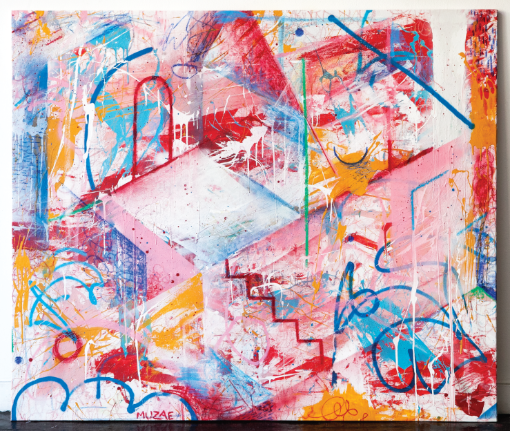 When it comes to artists who have inspired his work, Muzae stated names such as Matisse. He also cited abstract art and minimalist art having an impact on his work. “It was art like that which kind of gave me this rationale of anything goes, and that rationale entered my practice because I love pushing away from realism and seeing what I can do on a canvas”.