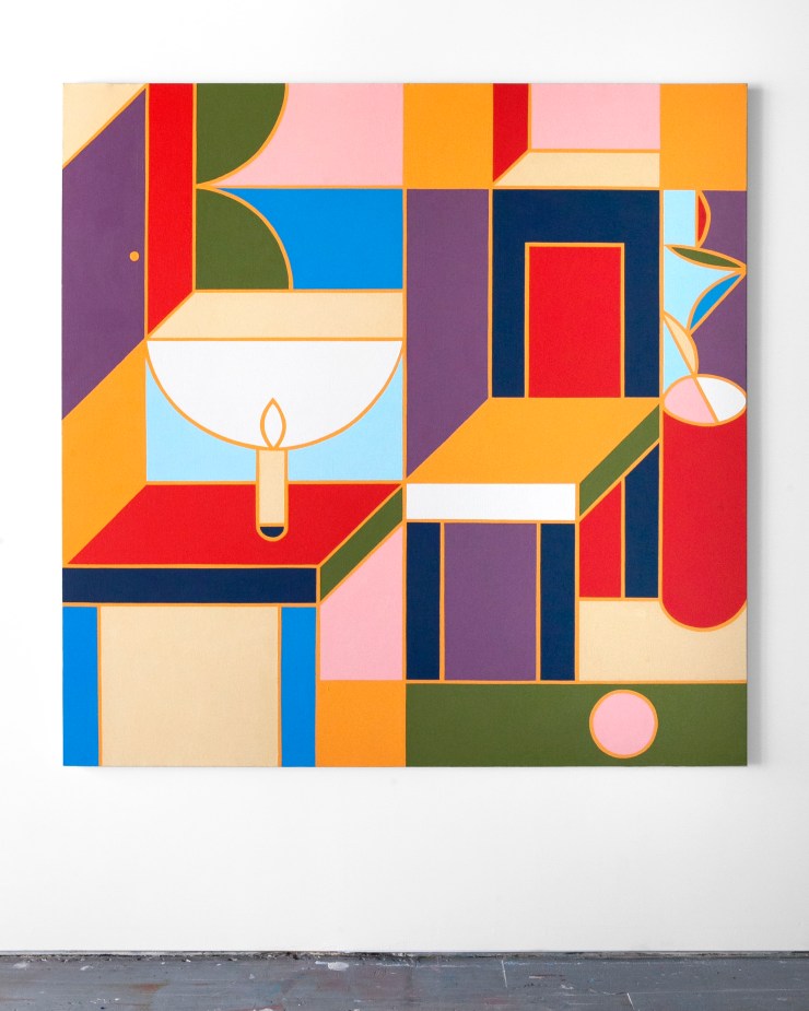 When I asked how he would describe his art, Muzae stated: “It’s something that is always changing. I depict space in a certain way that allows the viewer to enter and navigate the piece. It’s almost like a guided meditation where I can prompt things. So one thing I like to do is have two-dimensional planes of colour interacting with each other, and this along with spatial queues. So, in my paintings, you can sometimes see stairs or doors or chairs, and these are things we understand within a given space, and it’s this understanding I try to prompt, in order to make the viewer think. So once you are thinking, it is at that point you are navigating freely around the piece”.