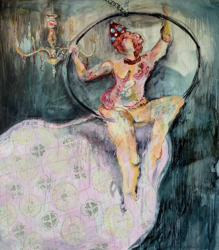 Furthermore, Aisha stated that the angle in which we see the female is deliberate too: “I wanted to incorporate this fourth wall aspect where the audience, which is the viewer, is looking at the performer from outside of the painting”. This is interesting because Aisha followed this up by stating: “This character we see is on a really high hoop, but we see no audience – she is actually performing for herself, and not us”.