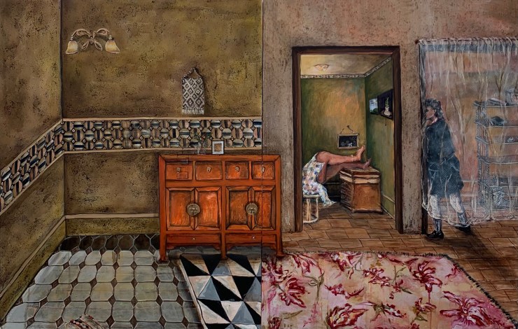 Like her other pieces, such as Be Careful with A Fool, Aisha still incorporates patterns. She uses two different patterns to distinguish the two spaces seen in this diptych. It’s clever, because we have two different spaces, but at the same time, we have one space, due to the brown cabinet uniting the two paintings. “I think when you look at it, it’s one room, right. But by using different styles and different patterns you can somehow distinguish there are two characters in this painting. Because you have one side which is more geometric, a bit more rigid, which could suggest the male character’s space, while the other side has a floral carpet, suggesting a female character”.
