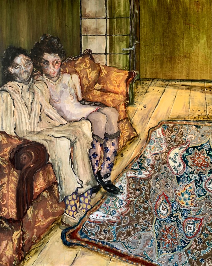 In this piece, we are presented with two figures, a man and a woman. Like Be Careful with A Fool, their facial expressions are unclear, but also, just like that piece, we don’t need facial expressions to know what is going on. If we just look at them, we can sense this nervousness. This is even more evident with the male figure – his hands cannot be seen. So it begs the questions, are his hands in his pocket? Or worse, are they in the crevices of the sofa? It should also be noted that his feet are underneath the rug. Aisha stated: “With this painting, I really wanted to exaggerate a lot of things, be it the space or certain emotions. As you said, the male character is hiding his feet – it’s almost as if he is frigid, he is uncomfortable”.