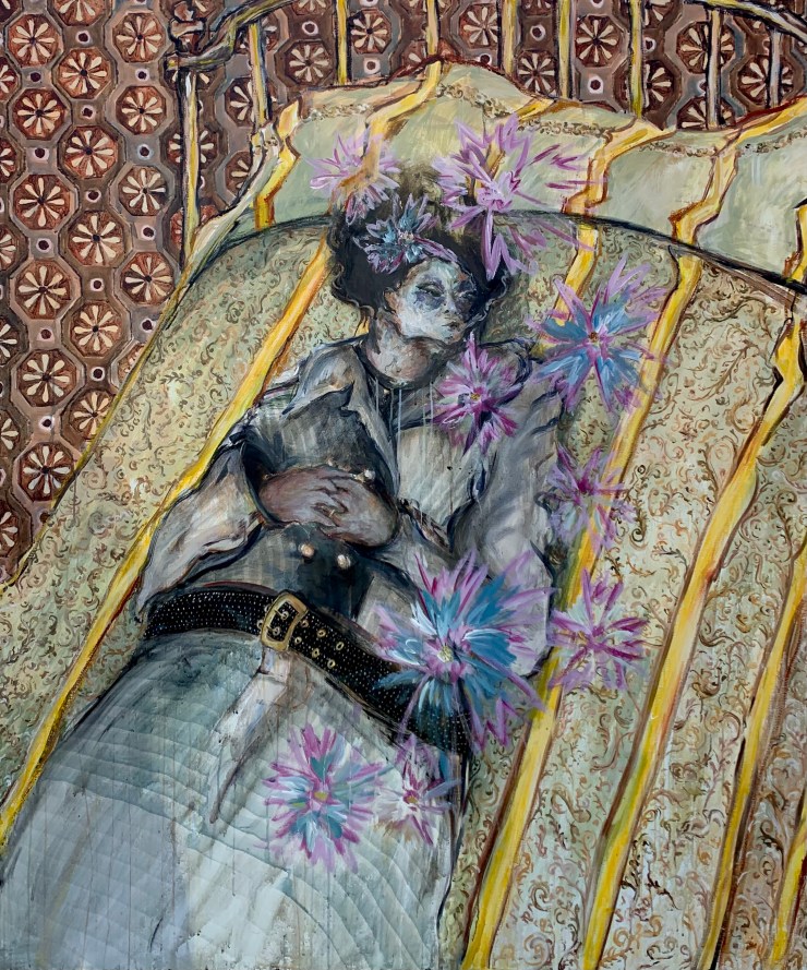 I asked Aisha if other people had the same initial impressions, and she said, yes. A vast amount of people thought the female in this piece was dead. “Yeah, you’re not the only one who has said that (smiles). The posture is interesting like you said, she has her hands on her stomach. So I can see why some would think she is on her death bed”.